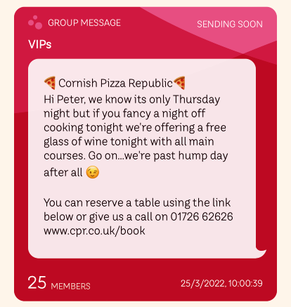 “ <business name> Hi <firstname> Thank you for dining with us at Cornish Pizza Republic, we value your feedback to monitor and continually improve our services. We'd love to know how likely you are to recommend us to your family and friends, 2 questions follow..."