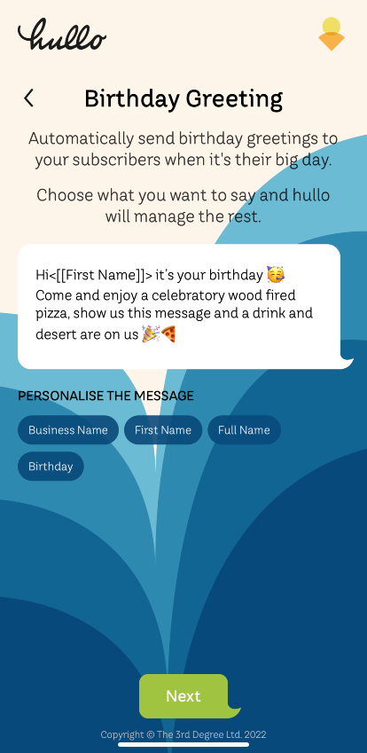 Sending an automated message with an offer on a customer's birthday is a great way to build the relationship and encourage loyalty. With hullo you can capture the day and month of a customer's birthday and then send an automated greeting when the big day comes.